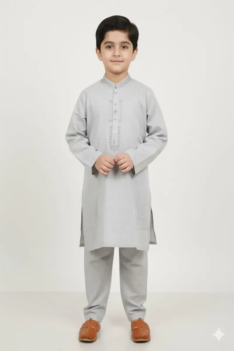 Clothing Boys Festive Wear Stitched 2 Piece Cotton Dar Al Fashion Blend Embroidery Moderate Thread Work Grey Size 20
