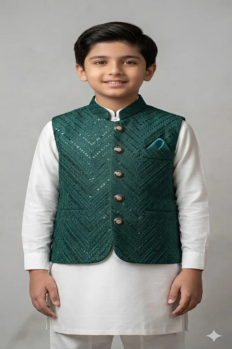 Clothing Boys Festive Wear Stitched Waistcoat Jamawar Dar Al Fashion Blend Embroidery Regular Thread Sequin Work Green Size 12 Waistcoat