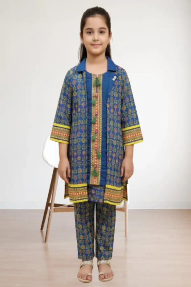 Clothing Girls Casual Wear Stitched 3 Piece Cotton Dar Al Fashion Blend Chiffon Dupatta Gala Daman Embroidered Moderate Print Work Blue Xsmall