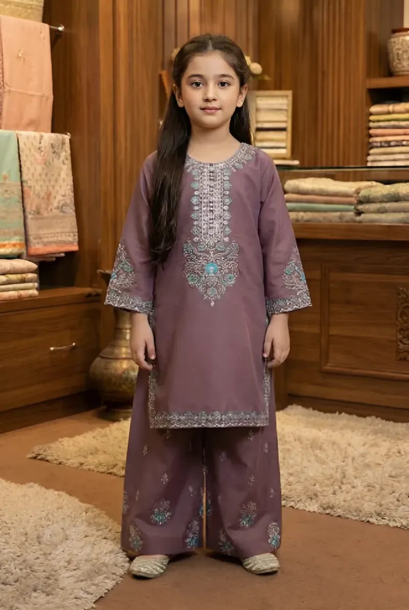 Clothing Girls Casual Wear Stitched 3 Piece Cotton Dar Al Fashion Blend Net Dupatta Gala Daman Embroidered Regular Thread Sequin Work Purple Size 28