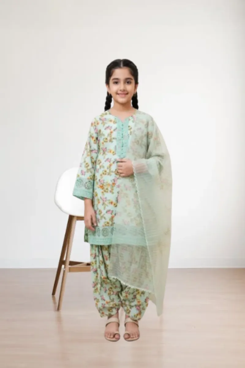 Clothing Girls Casual Wear Stitched 3 Piece Cotton Dar Al Fashion Blend Organza Dupatta Gala Daman Embroidered Heavy Thread Sequin Work Green Size 36