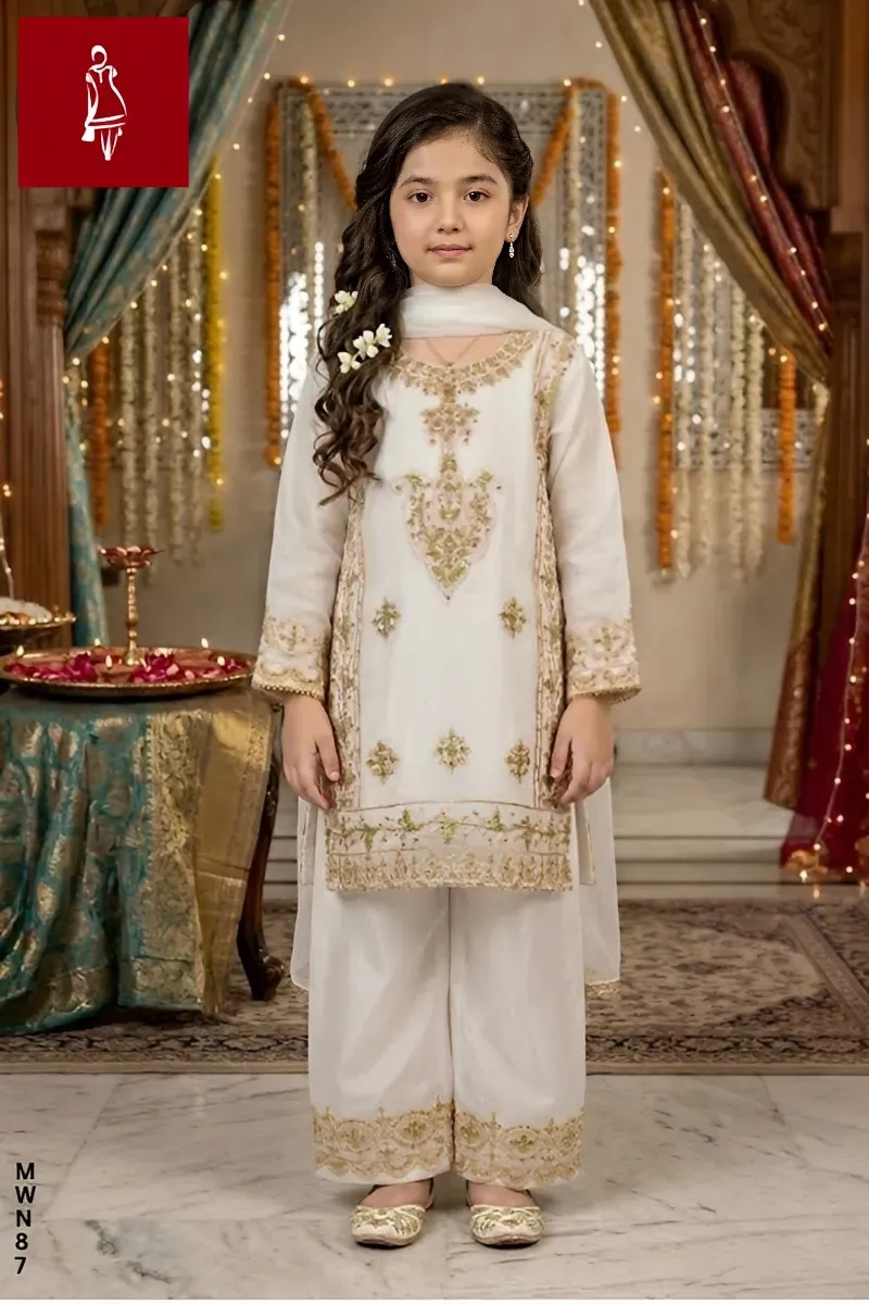 Clothing Girls Party Wear Stitched 3 Piece Organza Dar Al Fashion Blend Net Dupatta Gala Daman Embroidered Regular Thread Zari Work White Size 26