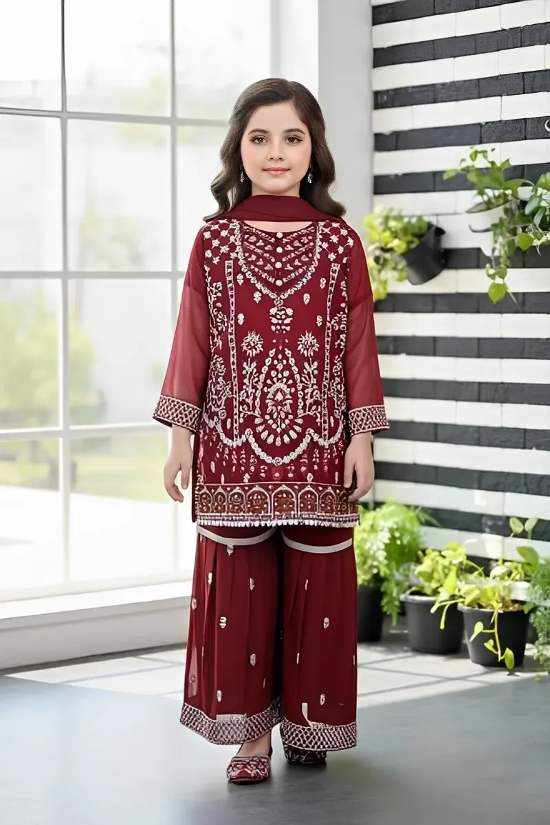 Clothing Girls Party Wear Stitched Garara Pant Semi Pure Chiffon Dar Al Fashion Blend Chiffon Dupatta Gala Daman Embroidered Moderate Zari Sequin Work Maroon Size 30