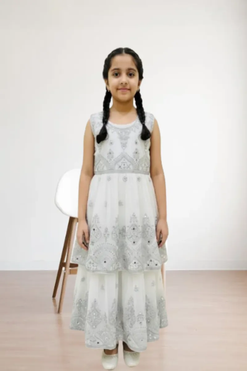 Clothing Girls Party Wear Stitched Gharara Shirts Chiffon Dar Al Fashion Blend Chiffon Dupatta Gala Daman Embroidered Moderate Zari Ston Work White Size 24