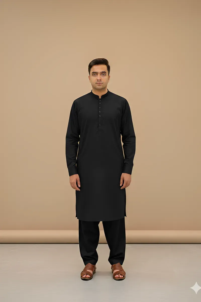 Clothing Men Casual Wear Stitched 2 Piece Cotton Dar Al Fashion Blend Embroidery Regular Thread Work Black Large Shahnsha