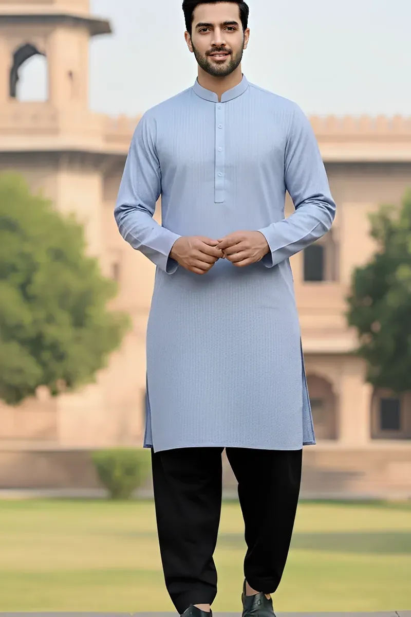 Clothing Men Casual Wear Stitched Kurta Shirt Cotton Dar Al Fashion Blend Embroidery Regular Thread Work Blue Large Gents Kurta