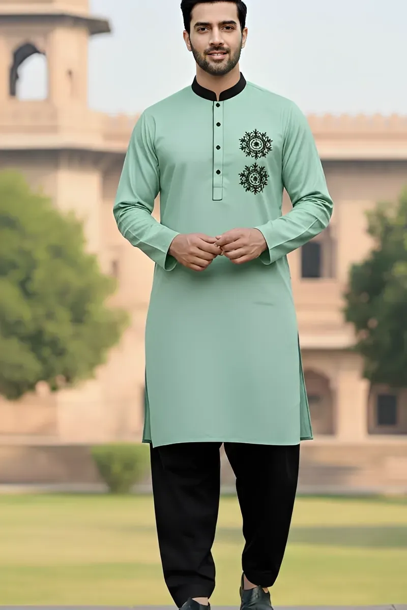 Clothing Men Casual Wear Stitched Kurta Shirt Cotton Dar Al Fashion Potpourri Embroidery Moderate Thread Work Green Small