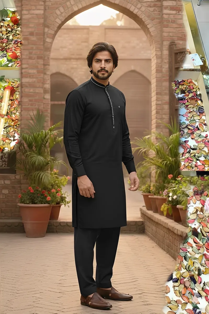 Clothing Men Festive Wear Stitched 2 Piece Cotton Dar Al Fashion Blend Plain Medium Plain Work Black Medium