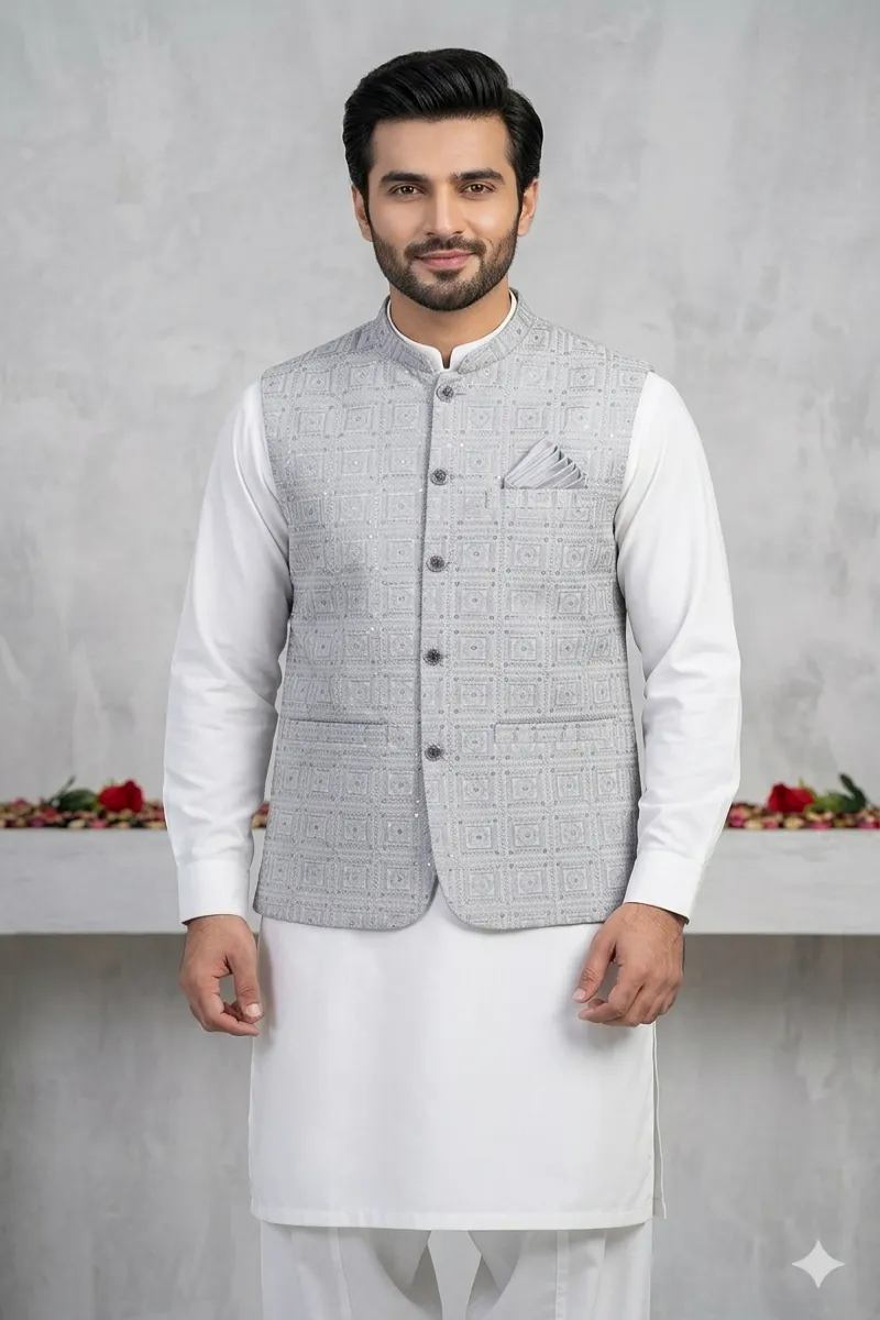 Clothing Men Festive Wear Stitched Waistcoat Jamawar Dar Al Fashion Blend Embroidery Regular Thread Sequin Work Grey Medium Waistcoat