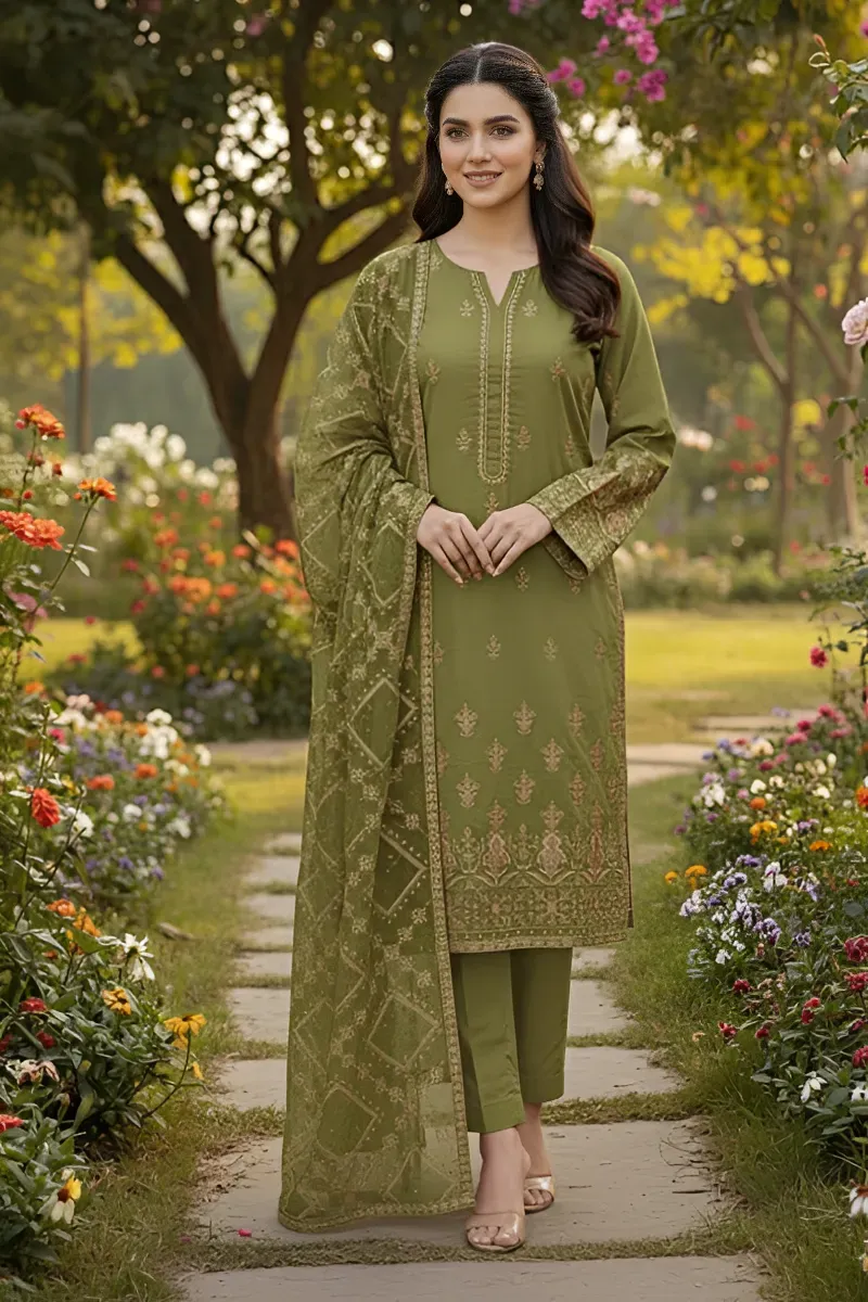 Clothing Women Casual Wear Un-stitched 3 Piece Cotton Dar Al Fashion Blend Chiffon Dupatta Front Back Embroidered Regular Thread Zari Work Mehndi