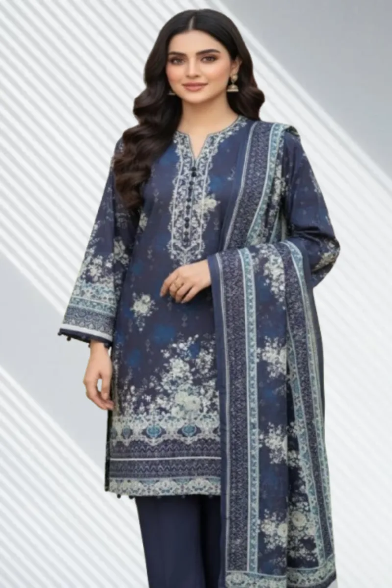 Clothing Women Casual Wear Un-stitched 3 Piece Cotton Dar Al Fashion Blend Cotton Dupatta Gala Daman Embroidered Heavy Plain Work Blue
