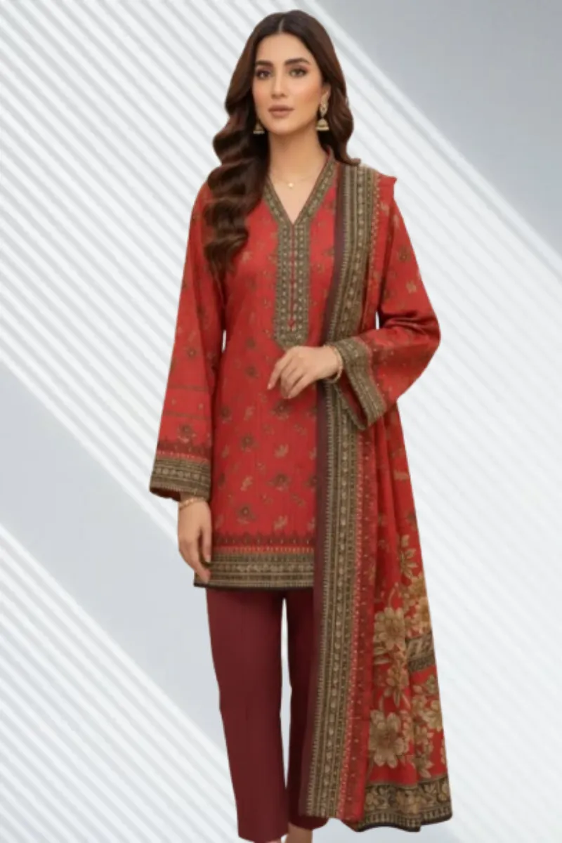 Clothing Women Casual Wear Un-stitched 3 Piece Cotton Dar Al Fashion Blend Cotton Dupatta Gala Daman Embroidered Heavy Plain Work Red