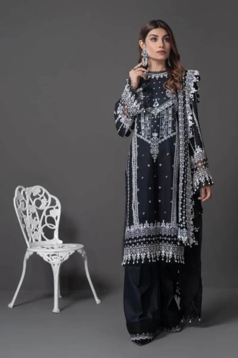 Clothing Women Casual Wear Un-stitched 3 Piece Lawn Anaya Monochrome Chiffon Dupatta Gala Daman Embroidered Moderate Thread Work Black