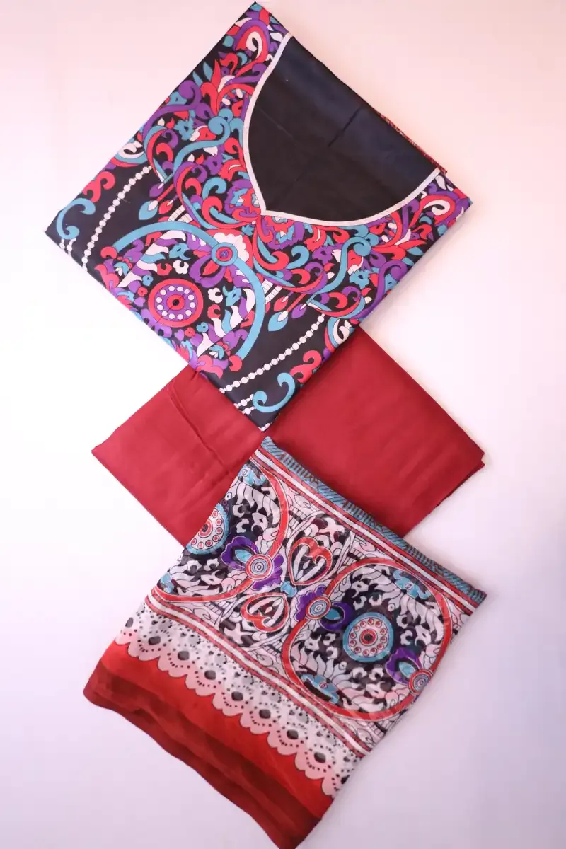 Clothing Women Casual Wear Un-stitched 3 Piece Lawn Dar Al Fashion Blend Chiffon Dupatta Gala Daman Embroidered Medium Plain Work Maroon