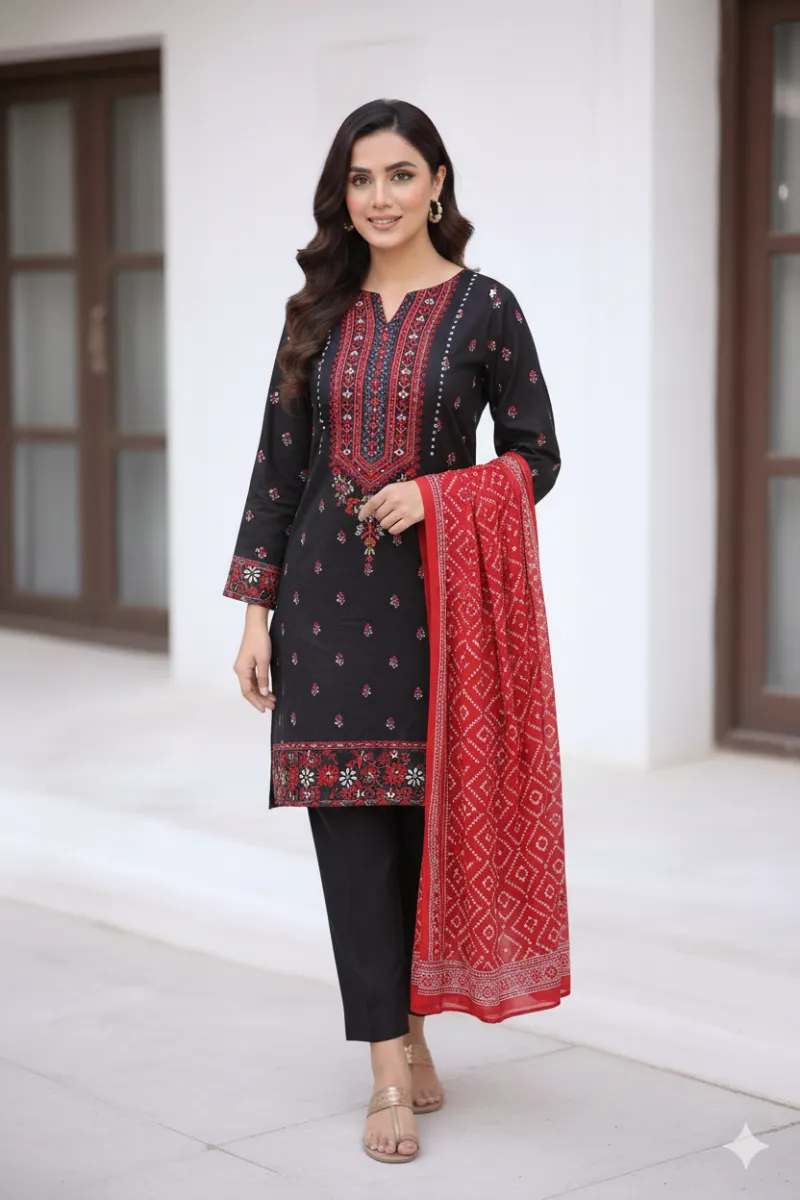 Clothing Women Casual Wear Un-stitched 3 Piece Lawn Dar Al Fashion Blend Cotton Dupatta Gala Daman Embroidered Heavy Plain Work Black