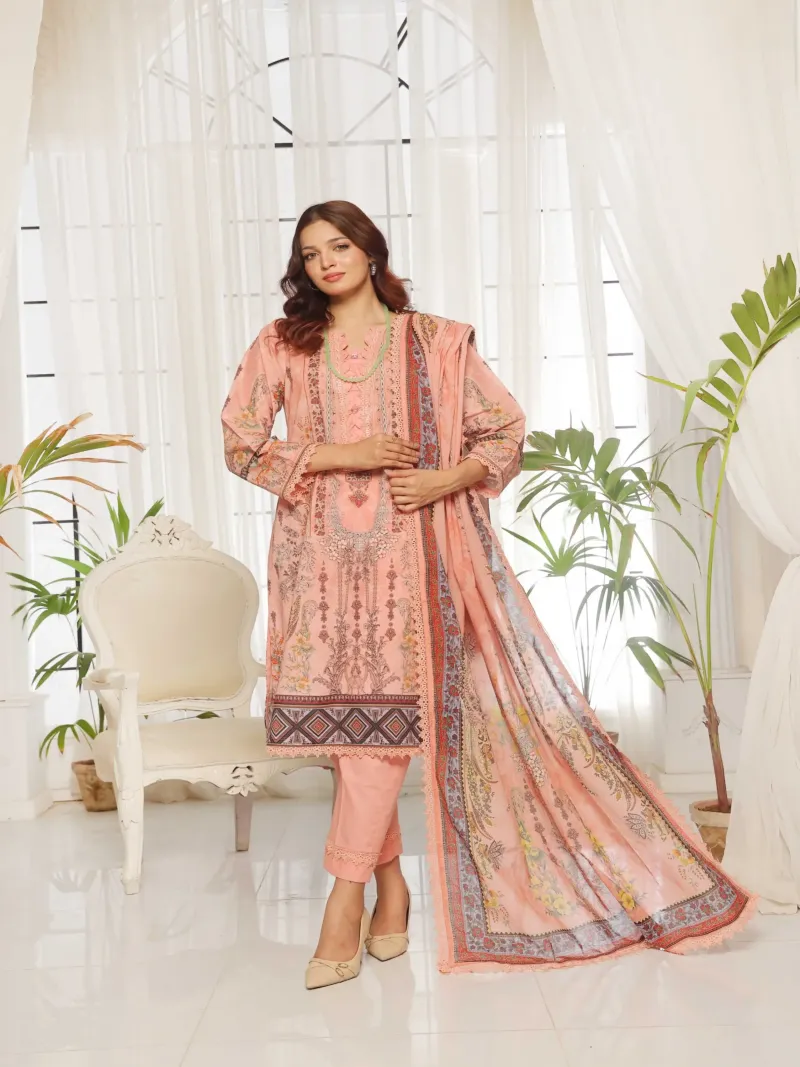 Clothing Women Casual Wear Un-stitched 3 Piece Lawn Dar Al Fashion Blend Cotton Dupatta Gala Daman Embroidered Moderate Print Work Peach D 7