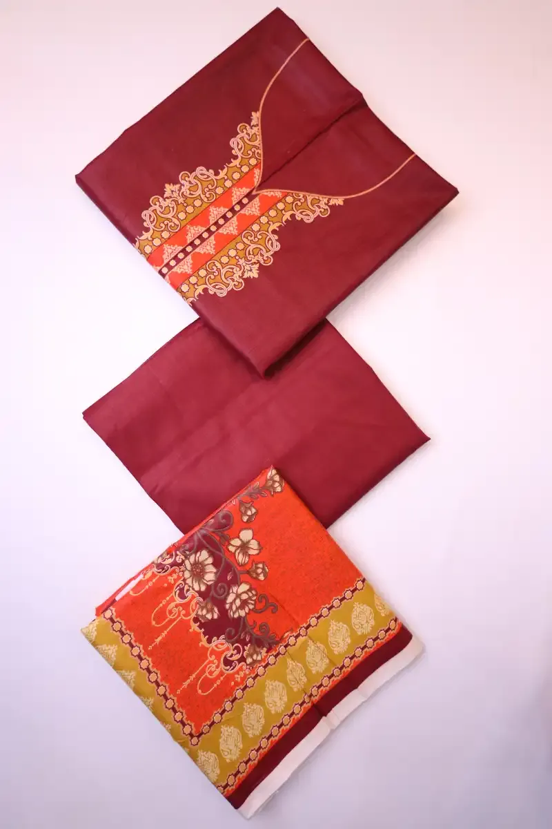 Clothing Women Casual Wear Un-stitched 3 Piece Lawn Dar Al Fashion Blend Cotton Dupatta Gala Daman Embroidered Regular Plain Work Maroon