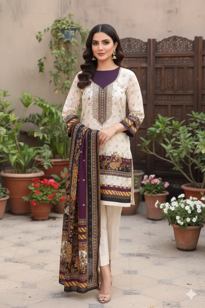 Clothing Women Casual Wear Un-stitched 3 Piece Lawn Dar Al Fashion Blend Lawn Dupatta Gala Daman Medium Plain Work Purple