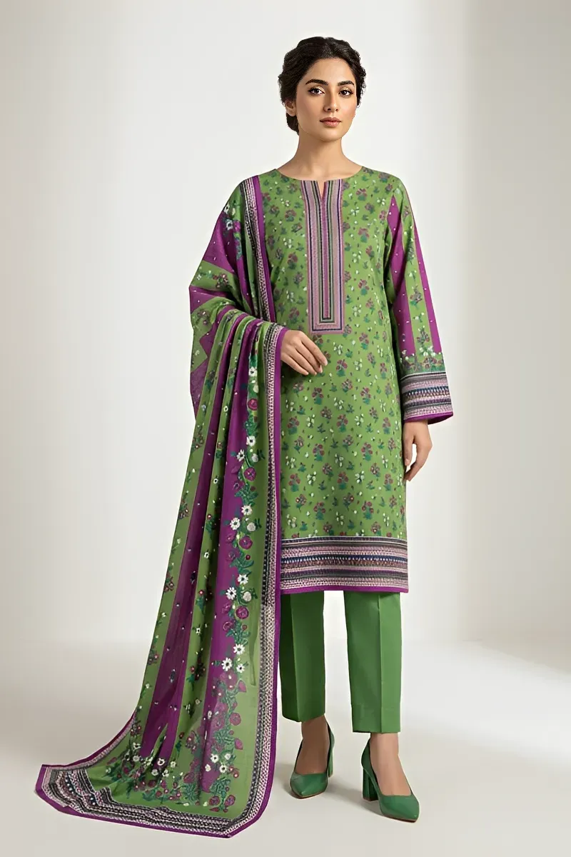 Clothing Women Casual Wear Un-stitched 3 Piece Lawn Dar Al Fashion Blend Lawn Dupatta Gala Daman Regular Print Work Green