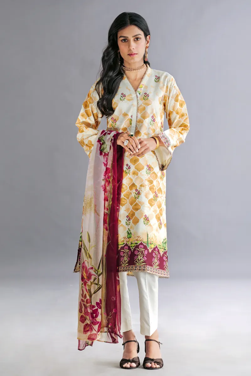 Clothing Women Casual Wear Un-stitched 3 Piece Lawn Gul Ahmed Collection Chiffon Dupatta Gala Daman Embroidered Regular Thread Zari Work Mustard