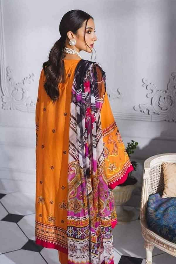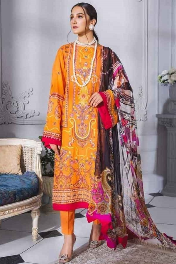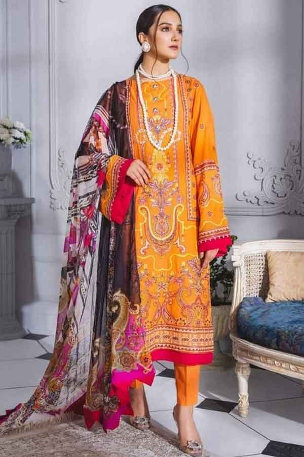 Clothing Women Casual Wear Un-stitched 3 Piece Lawn Maryams Blend Chiffon Dupatta Gala Daman Embroidered Moderate Thread Zari Work Mustard