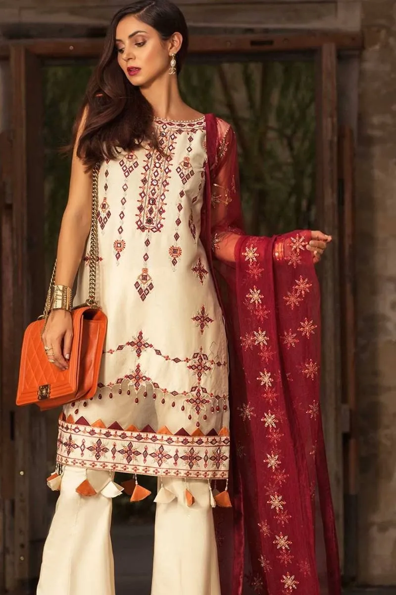 Clothing Women Casual Wear Un-stitched 3 Piece Lawn Noor By Saadia Blend Net Dupatta Gala Daman Embroidered Moderate Thread Zari Work Cream