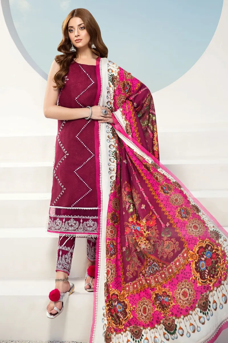 Clothing Women Casual Wear Un-stitched 3 Piece Linen Noor By Saadia Winter Collection Woven Dupatta Front Back Embroidered Regular Multi Work Maroon