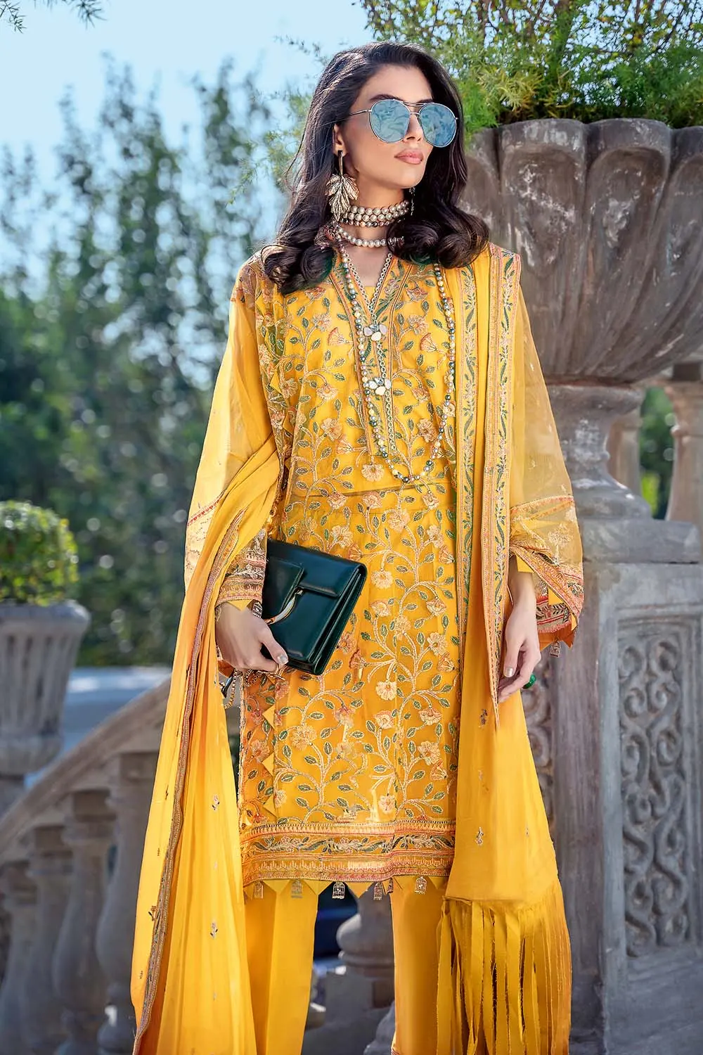 Clothing Women Casual Wear Un-stitched 3 Piece Net Gul Ahmed Collection Chiffon Dupatta Front Back Embroidered Heavy Multi Work Mustard