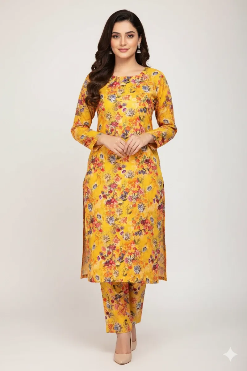 Clothing Women Casual Wear Un-stitched Shirt Lawn Dar Al Fashion Blend Printed Dupatta Allover Moderate Print Work Yellow 1