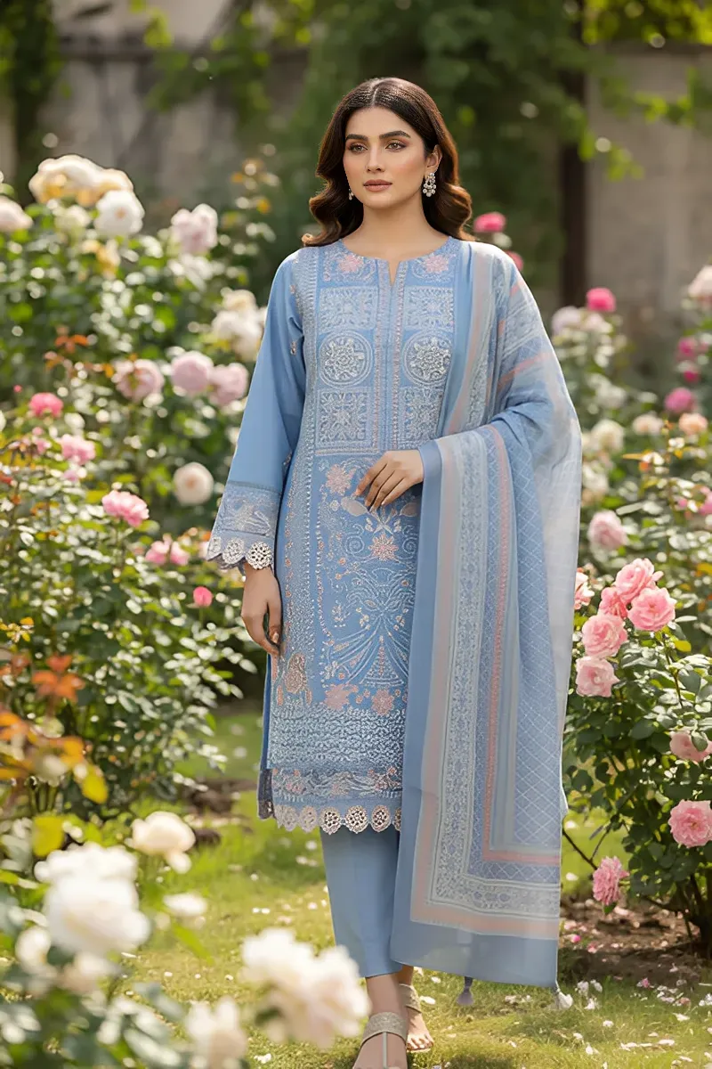 Clothing Women Casual Wear Stitched 3 Piece Cotton Dar Al Fashion Blend Chiffon Dupatta Gala Daman Embroidered Heavy Thread Sequin Work Blue Small