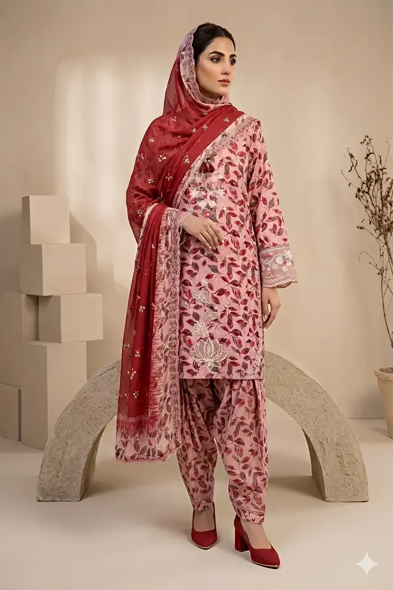 Clothing Women Casual Wear Stitched 3 Piece Cotton Dar Al Fashion Blend Chiffon Dupatta Gala Daman Embroidered Heavy Thread Sequin Work Pink Small