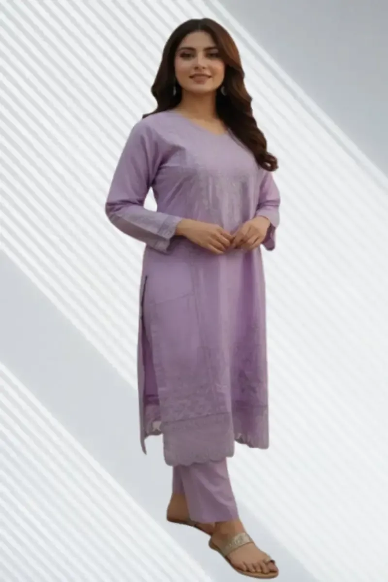 Clothing Women Casual Wear Stitched 3 Piece Cotton Dar Al Fashion Blend Chiffon Dupatta Gala Daman Embroidered Heavy Thread Sequin Work Purple Large