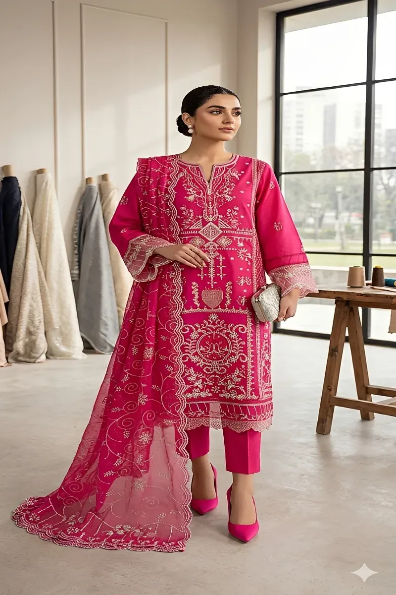 Clothing Women Casual Wear Stitched 3 Piece Jacquard Dar Al Fashion Blend Chiffon Dupatta Gala Daman Embroidered Heavy Thread Sequin Work Pink Medium