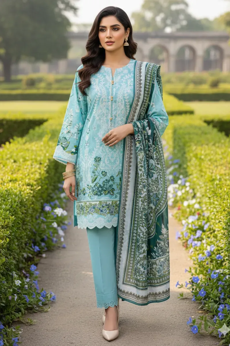Clothing Women Casual Wear Stitched 3 Piece Lawn Dar Al Fashion Blend Lawn Dupatta Gala Daman Regular Print Work Blue Small