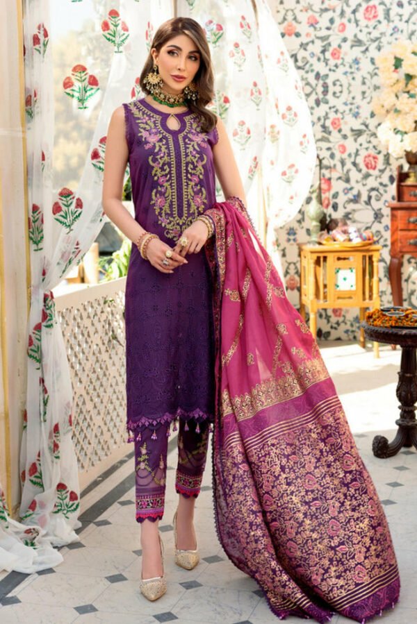 Clothing Women Festive Wear Un-stitched 3 Piece Lawn Noor By Saadia Chikenkari Silk Dupatta Gala Daman Embroidered Moderate Multi Work Purple
