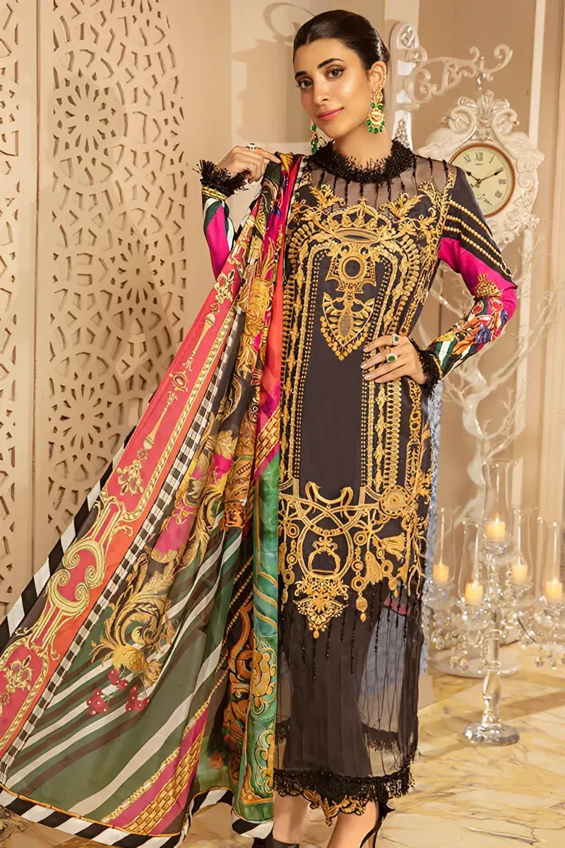 Clothing Women Festive Wear Un-stitched 3 Piece Lawn Rang Rasiya Carnation Silk Dupatta Gala Daman Embroidered Moderate Thread Zari Work Black