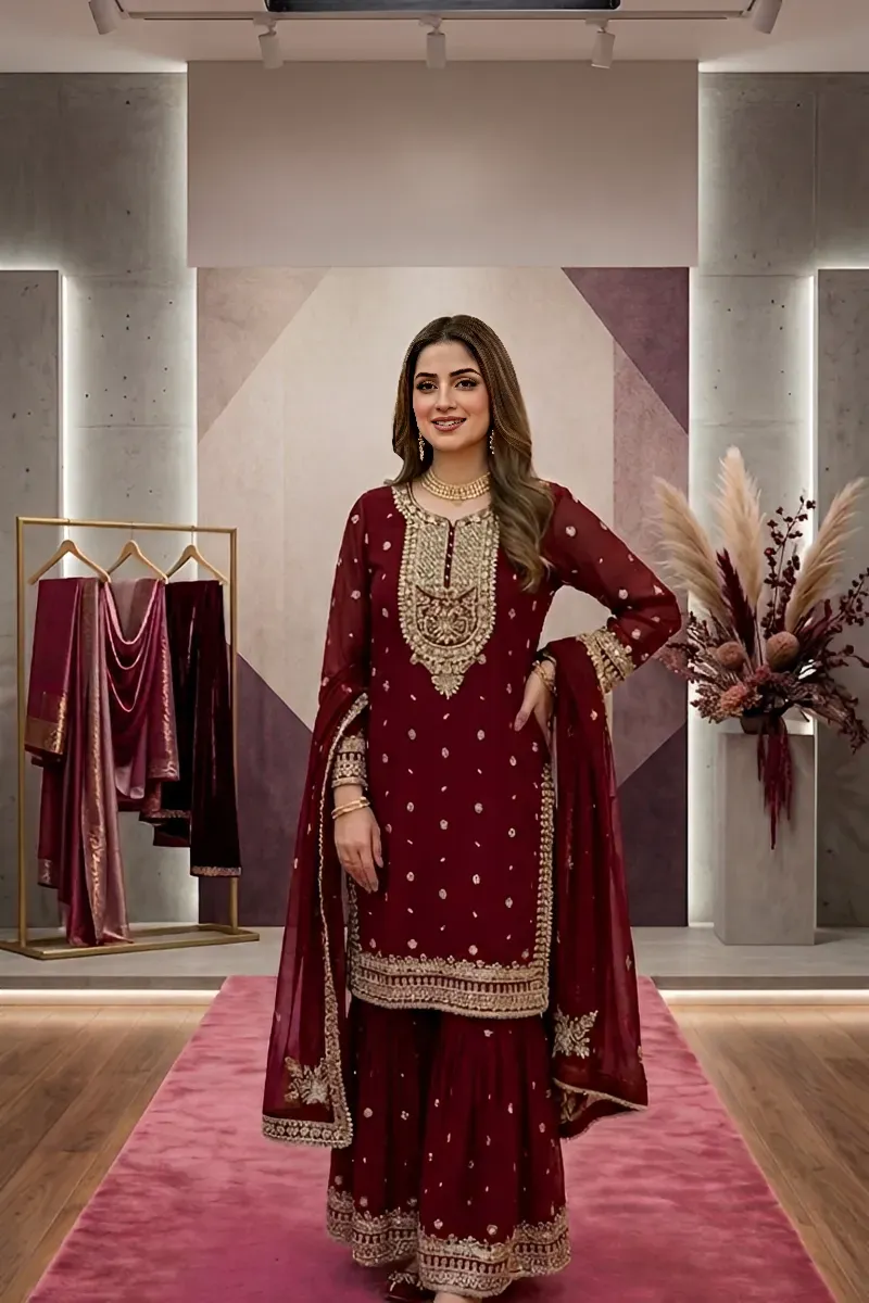 Clothing Women Festive Wear Stitched Gharara Shirts Semi Pure Chiffon Dar Al Fashion Blend Chiffon Dupatta Gala Daman Embroidered Regular Thread Sequin Work Maroon Medium Stitched