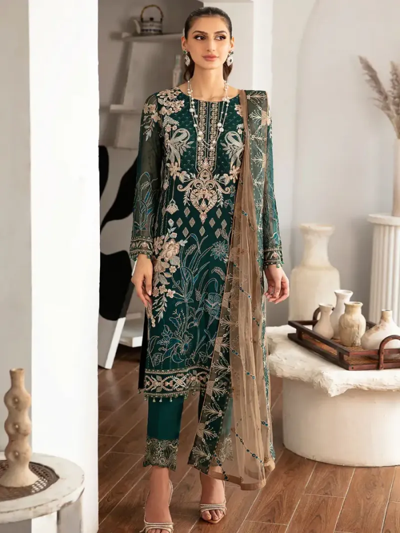 Clothing Women Party Wear Un-stitched 3 Piece Chiffon Dar Al Fashion Blend Net Dupatta Gala Daman Embroidered Moderate Thread Zari Work Green D 1101