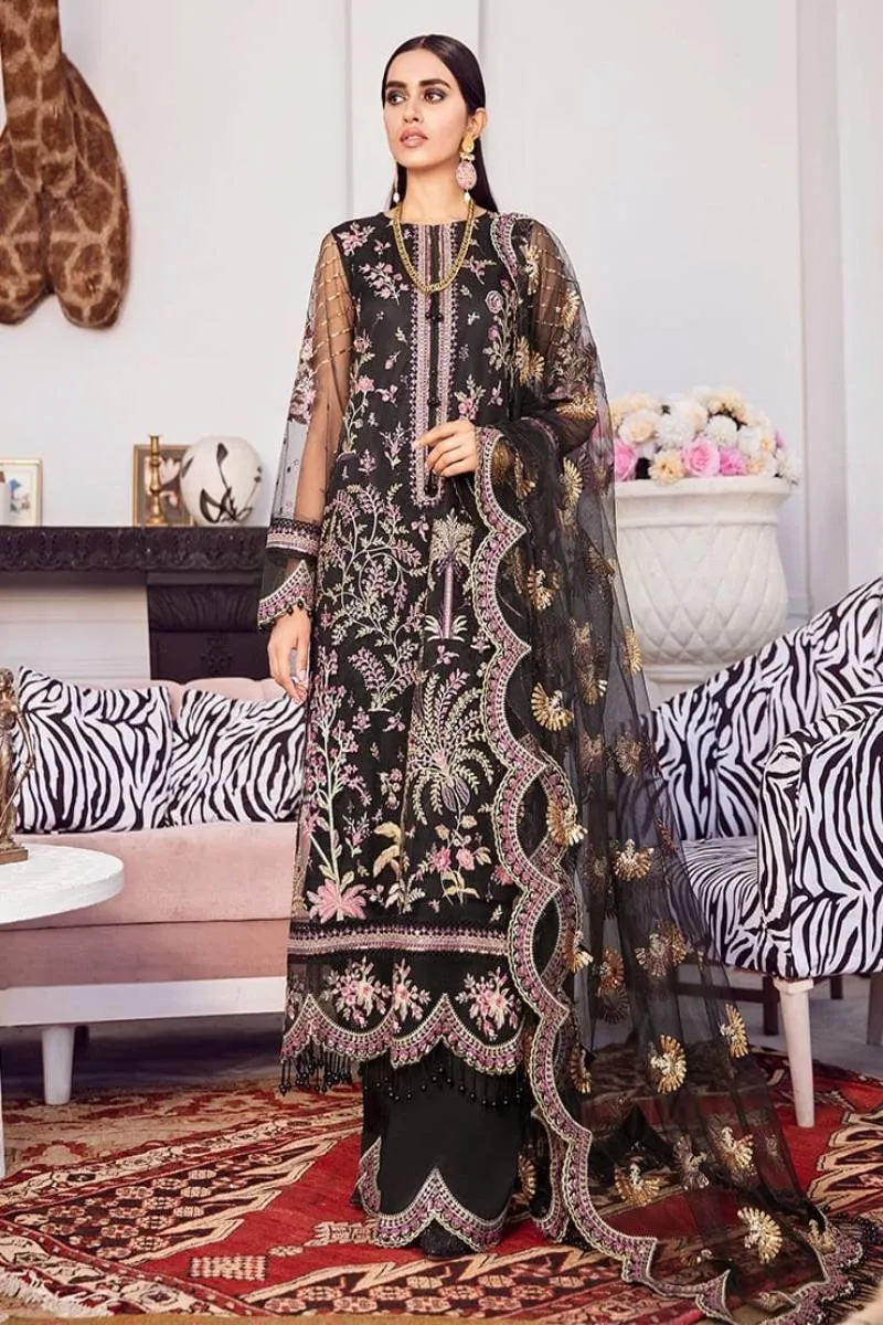 Clothing Women Party Wear Un-stitched 3 Piece Net Afrozeh Lafuchaia Organza Dupatta Gala Daman Embroidered Moderate Multi Work Black