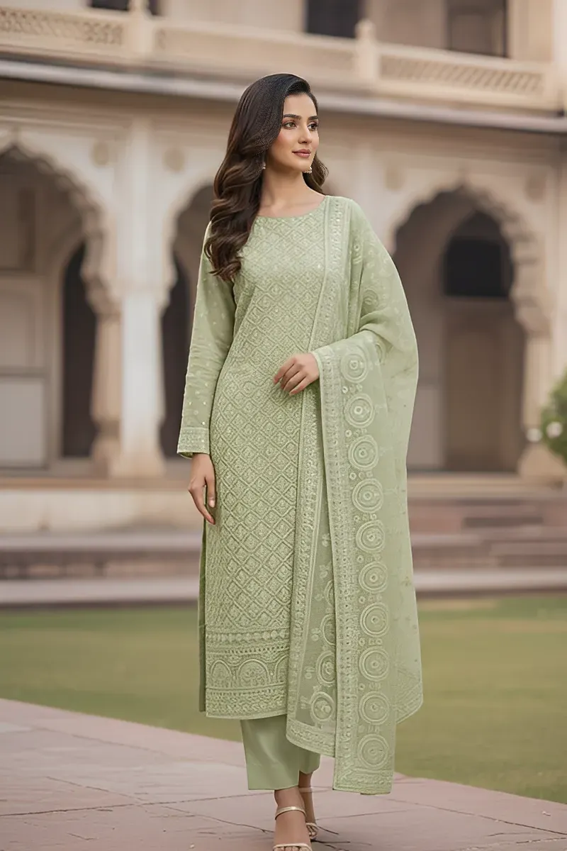 Clothing Women Party Wear Un-stitched 3 Piece Net Dar Al Fashion Potpourri Net Dupatta Front Back Embroidered Regular Thread Sequin Work Green
