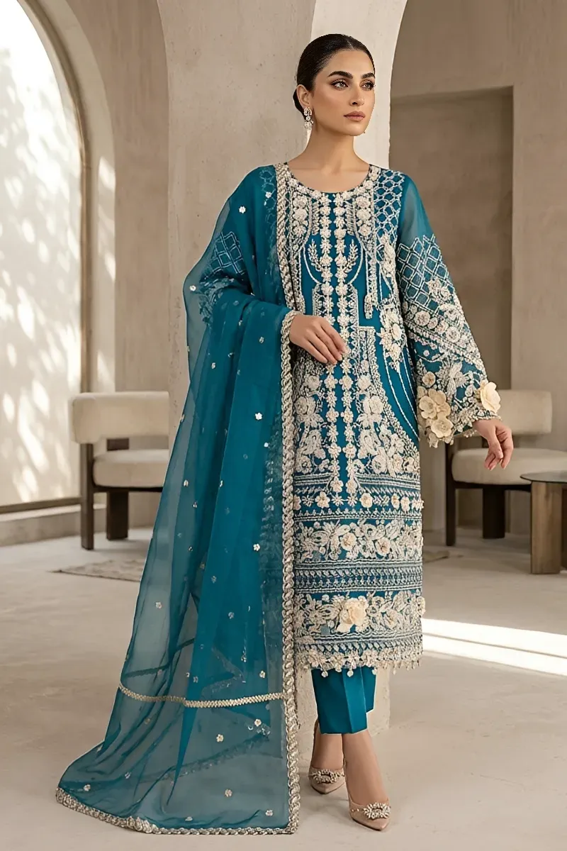Clothing Women Party Wear Un-stitched 3 Piece Organza Alam Fabrics Blend Organza Dupatta Gala Daman Embroidered Heavy Zari Ston Work Green Zink