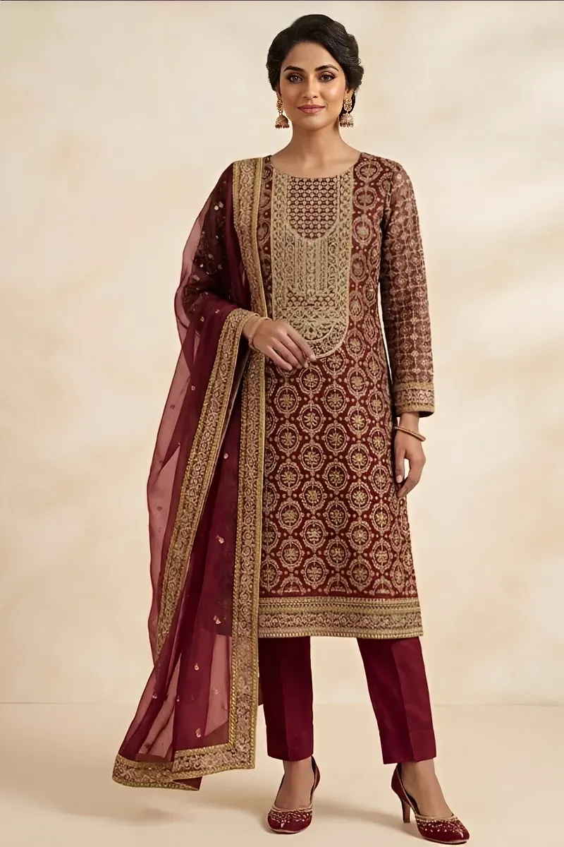 Clothing Women Party Wear Un-stitched 3 Piece Organza Alam Fabrics Blend Organza Dupatta Gala Daman Embroidered Heavy Zari Ston Work Maroon Mahroon