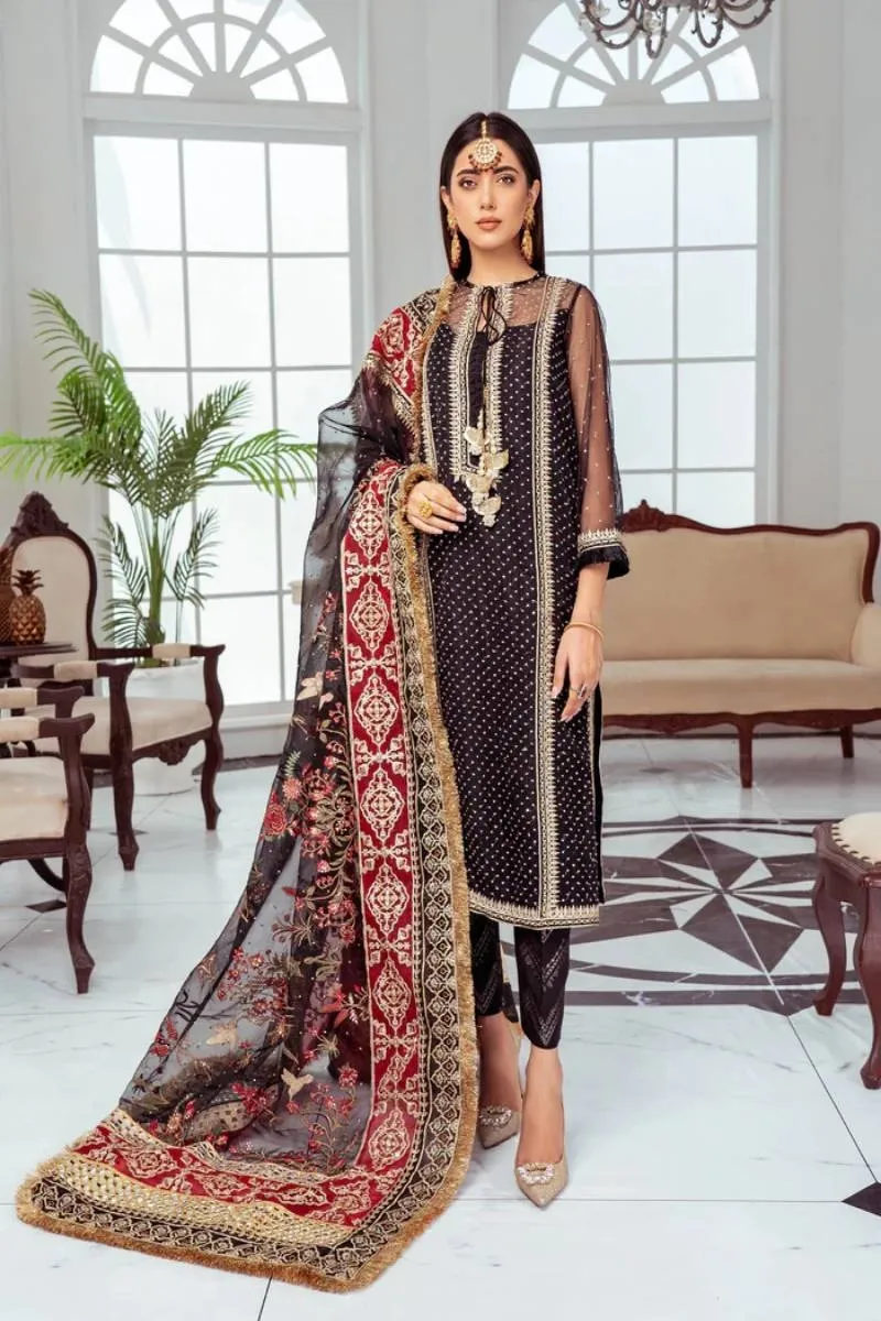 Clothing Women Party Wear Un-stitched 3 Piece Organza Maryam N Maria Blend Organza Dupatta Gala Daman Embroidered Heavy Multi Work Black
