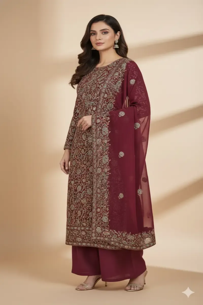 Clothing Women Party Wear Un-stitched 3 Piece Chiffon Dar Al Fashion Blend Chiffon Dupatta Allover Embroidered Heavy Thread Zari Work Maroon 8552