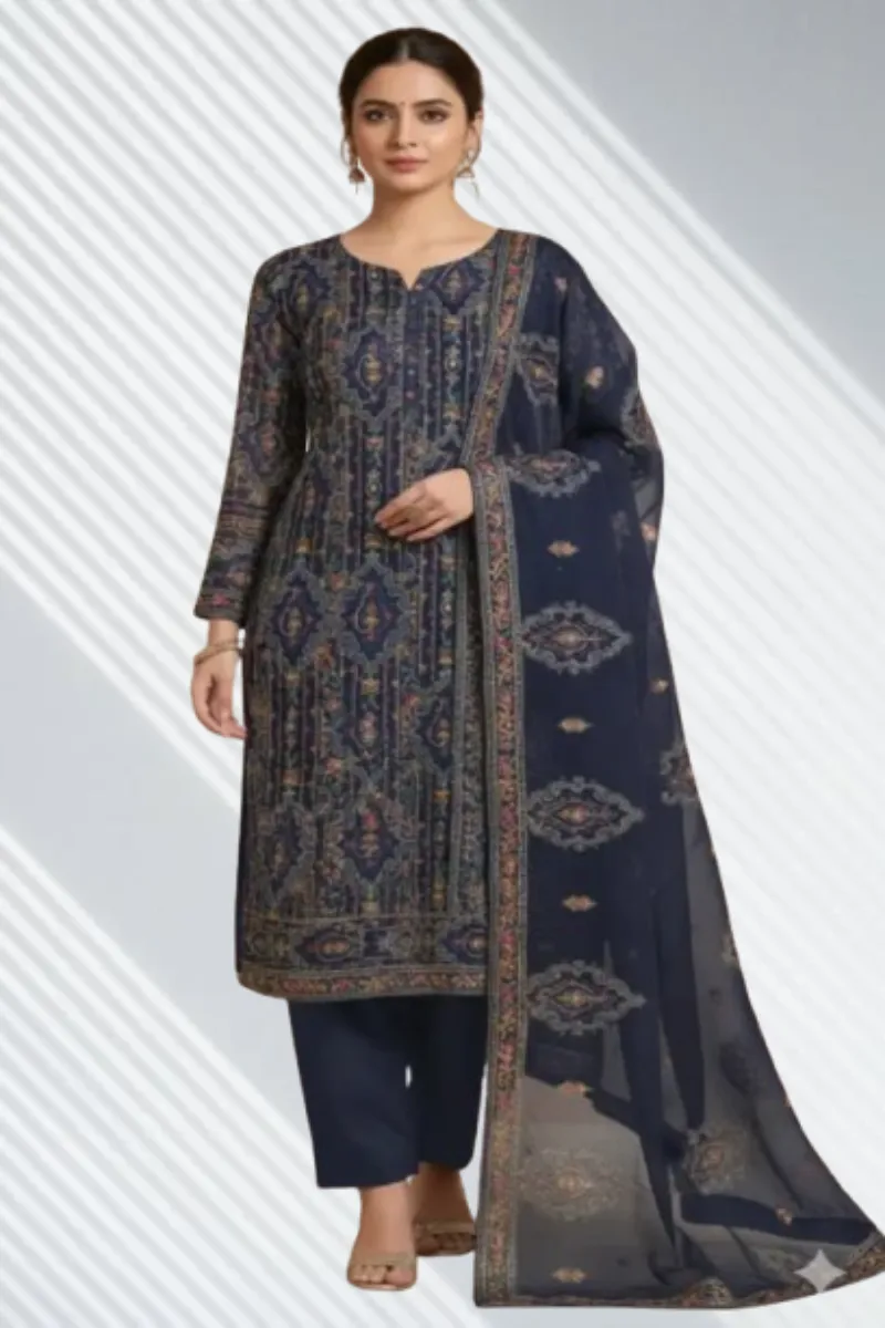Clothing Women Party Wear Un-stitched 3 Piece Chiffon Dar Al Fashion Blend Chiffon Dupatta Front Back Embroidered Heavy Thread Zari Work Blue 0.003