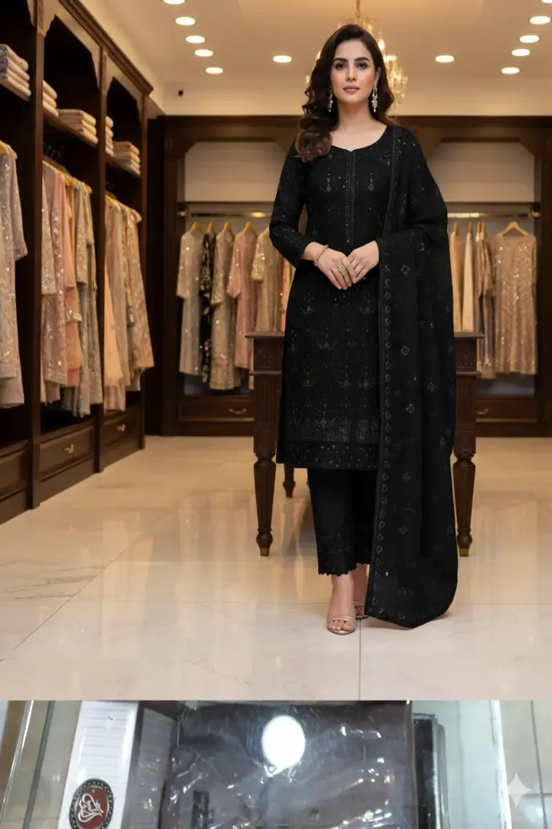 Clothing Women Party Wear Un-stitched 3 Piece Chiffon Dar Al Fashion Blend Chiffon Dupatta Front Back Embroidered Moderate Thread Sequin Work Black