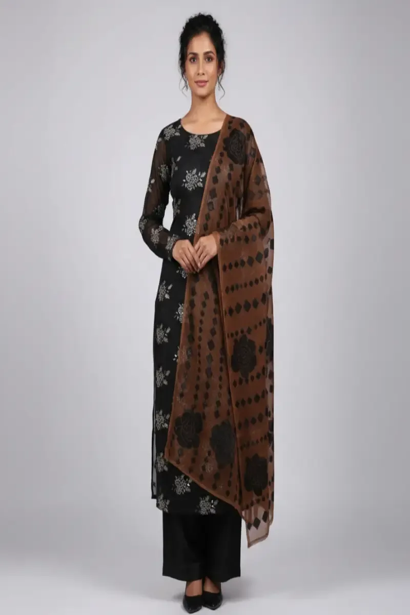 Clothing Women Party Wear Un-stitched 3 Piece Chiffon Dar Al Fashion Blend Chiffon Dupatta Front Back Embroidered Moderate Thread Zari Work Black